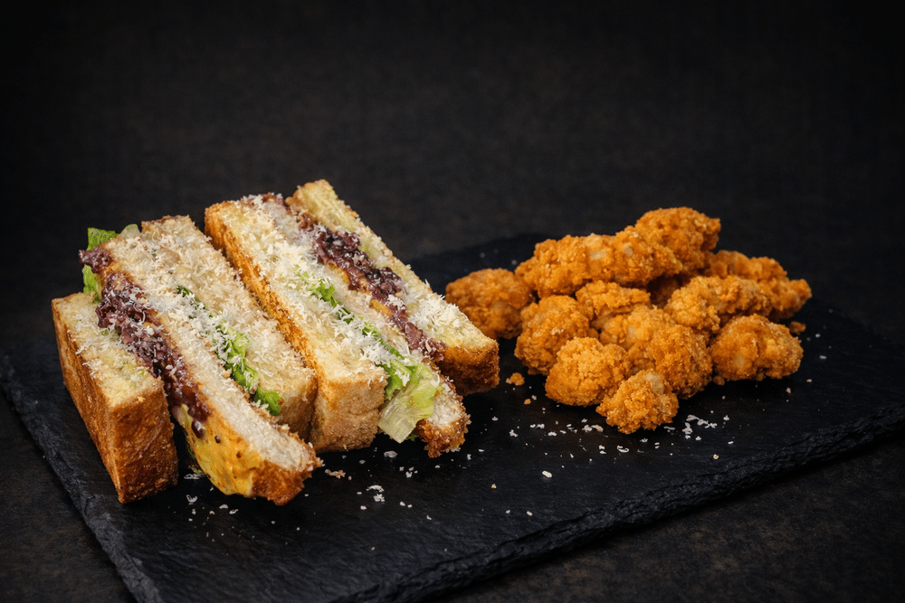 Сэндвич: Куриное филе в панировке, луковый мармелад, салат ромен, чеддер, тёртый пармезан, трюфельный соус, фирменный соус, сливочная бриошь. Куриные нагетсы в панировке