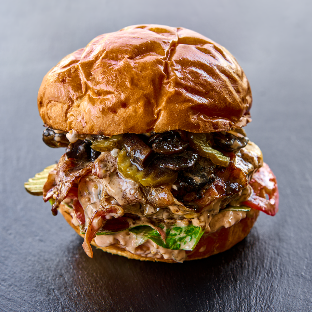 Котлета из мраморной говядины, сливочная бриошь, жареный бекон, рагу из шампиньонов, чеддер, свежий томат, маринованный огурец, листья ромена, фирменный соус. (Наши котлеты-прожарки Medium)