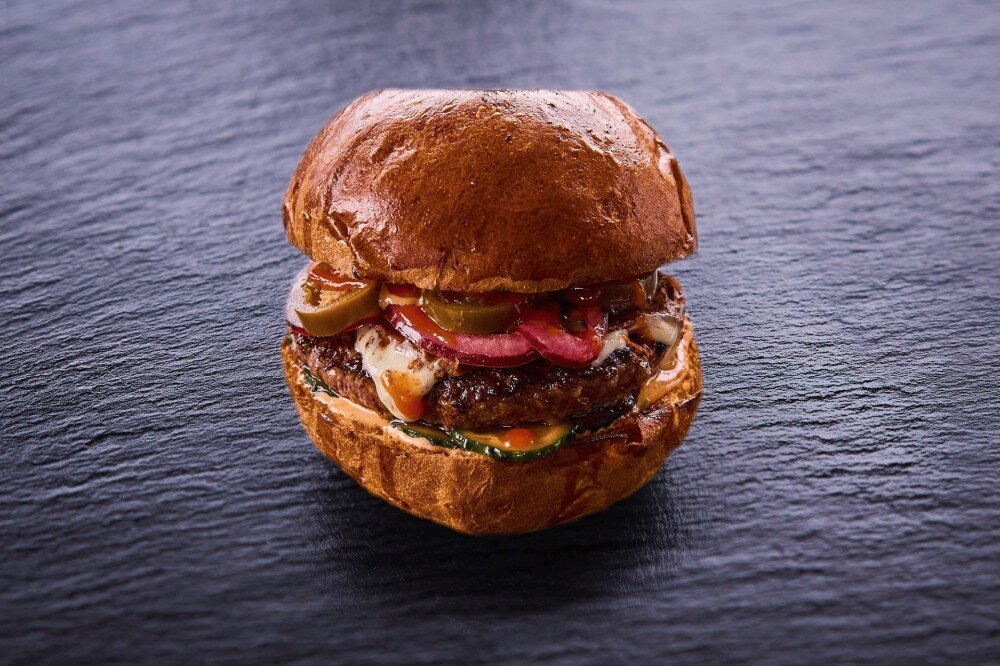 Котлета из мраморной говядины, сливочная бриошь, салат, перец халапеньо, жареная моцарелла, свежий огурец, тайские огурцы, лук маринованный, соус острый фирменный, соус шрирача. (Наши котлеты-прожарки Medium)
