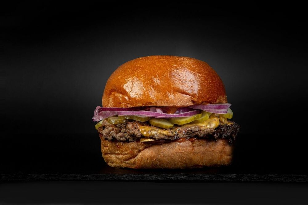 Две прессованные говяжьи котлеты с хрустящей корочкой, сливочная бриошь, чеддер, маринованный огурец, лук маринованный, соус фирменный BBQ-смоук
