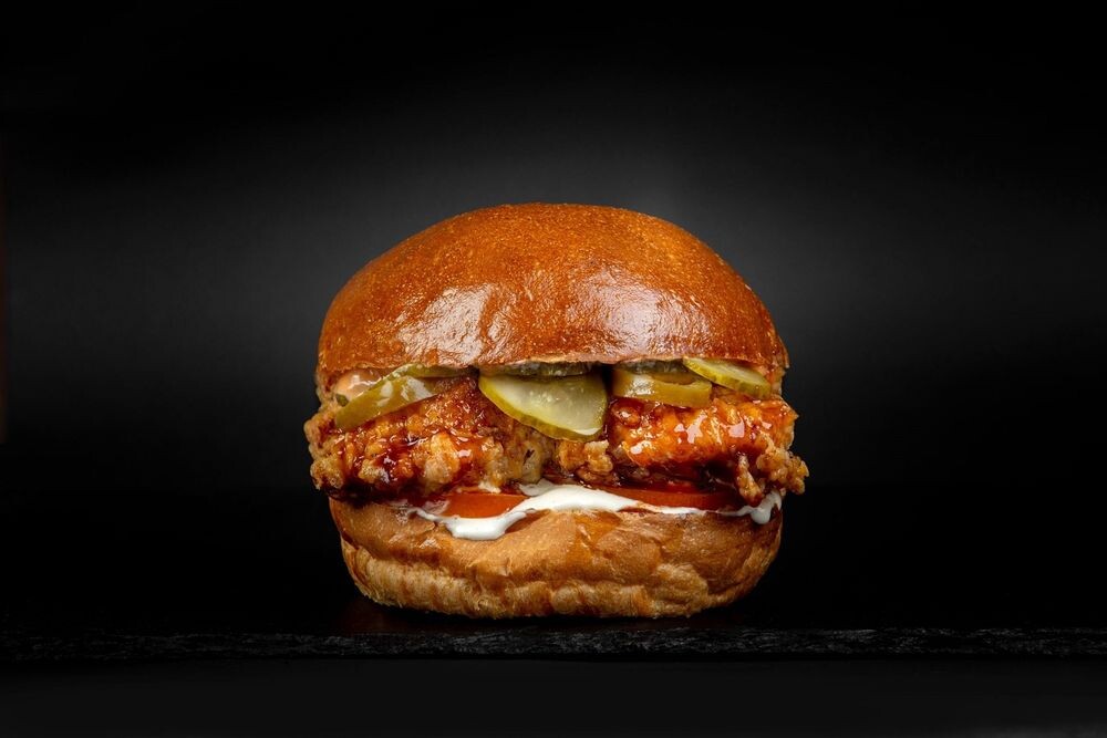 Сочное куриное бедро в глазуре чили-мёд, сливочная бриошь, свежий томат, маринованные огурцы, перец халапеньо, соусы фирменные острый и чесночный