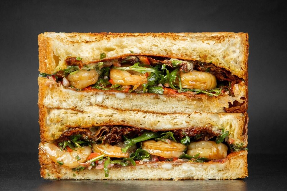 Креветки обжаренные с соусом терияки и соевым соусом, сливочная бриошь с корочкой из моцареллы, вяленые томаты, руккола, соусы фирменные песто и чимичурри