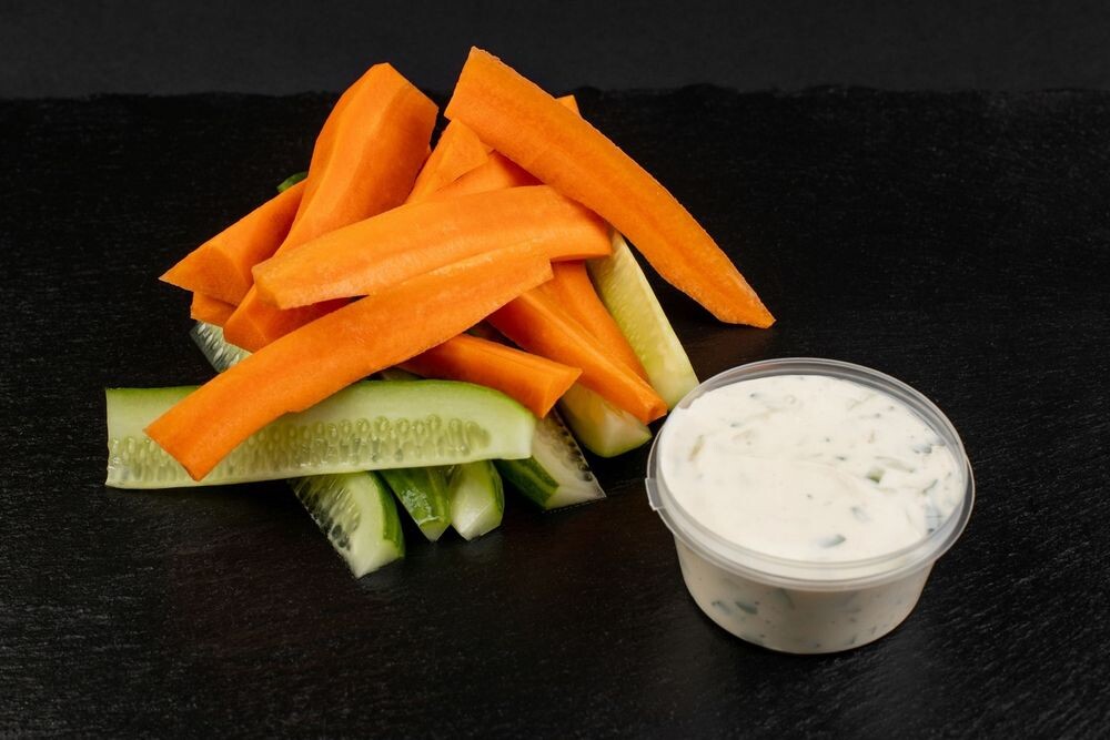 Огурец свежий, морковь свежая, фирменный соус дзадзики