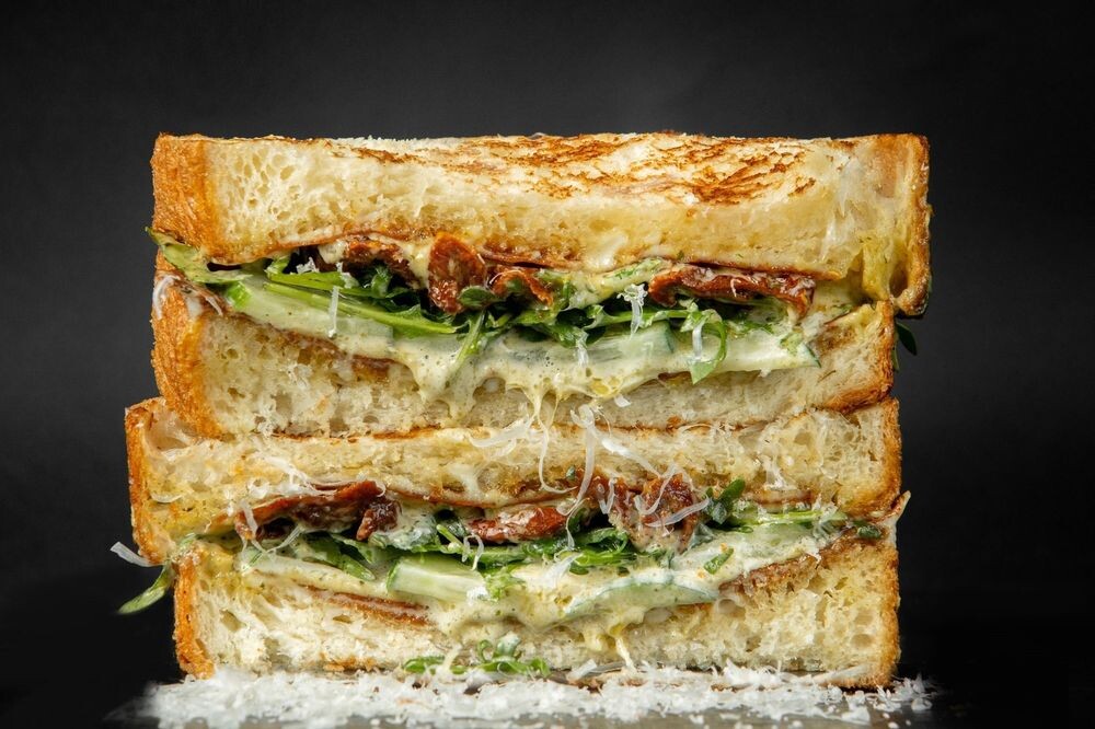 Сливочная бриошь с корочкой из моцареллы, вяленные томаты, руккола, свежий огурец, соус фирменный песто, тёртый пармезан