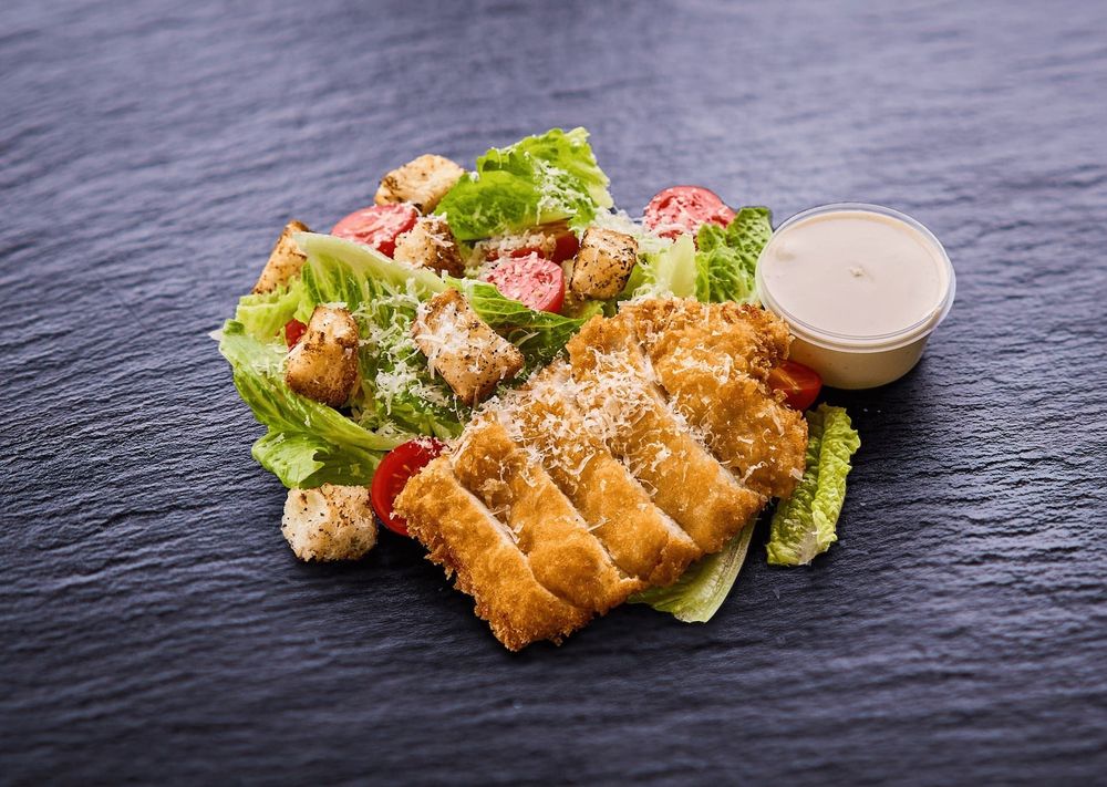 Шницель куриный, салат ромен, помидоры черри, сухари, сыр пармезан, соус фирменный