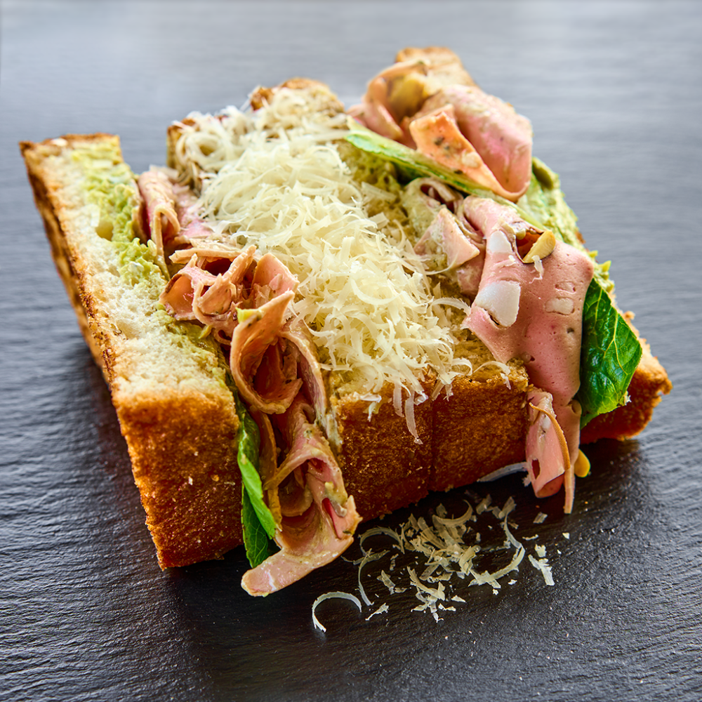 Ломтики мортаделлы с фисташками, хрустящий салат ромен, гуакамоле, фирменный соус, тёртый пармезан, сливочная бриошь