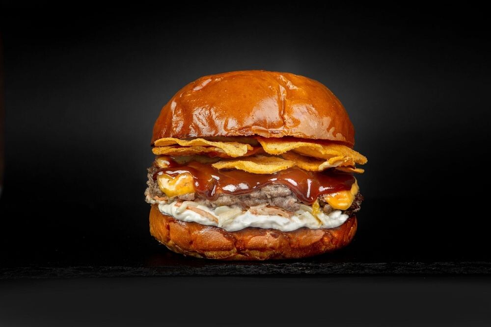 Сочная говяжья котлета, сливочная бриошь, хрустящие чипсы начос, салат коул-слоу, чеддер, BBQ-смоук, соус фирменный ремулад(в составе соуса присутствует красный свежий лук)